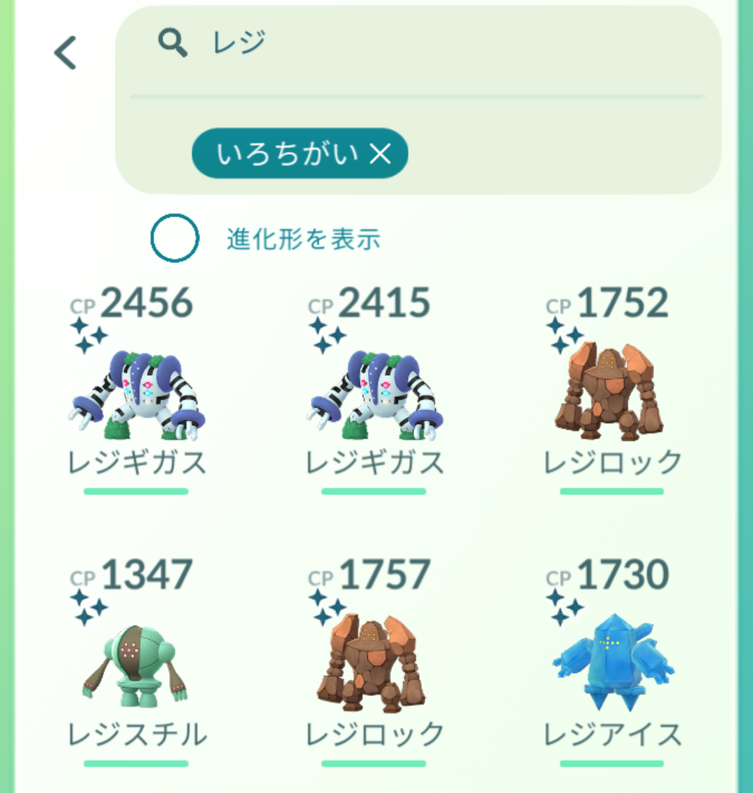 レジギガスの色違いはレジスチルとレジロックとレジアイス全ての色違いを揃えないと出現しないんだ